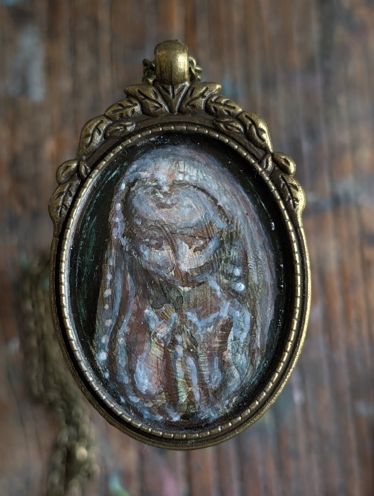 2" brass pendant, with a matching brassy chain. An original tempera painting. A tiny bit of hope is a quiet meditation inspired by Mary. The perfect gift for someone dear. Finished in varnish. ...Careful not to get her wet!