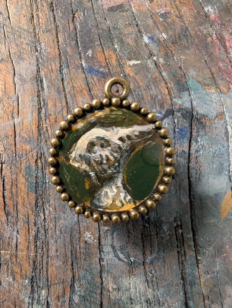Under 1" round bread pendant of a darking little bunny face. Painted in egg tempera especially for you.